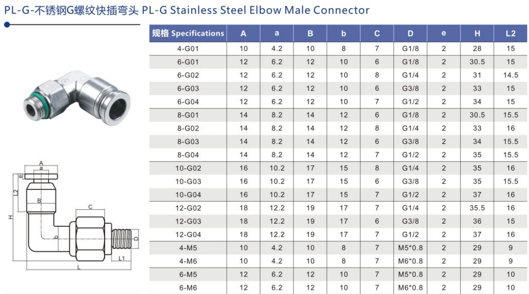 PL 公制 φ3.2,φ4,φ6,φ8,φ10,φ12,φ16 M5・M6・M8・M10・G 1/8,1/4,3/8,1/2